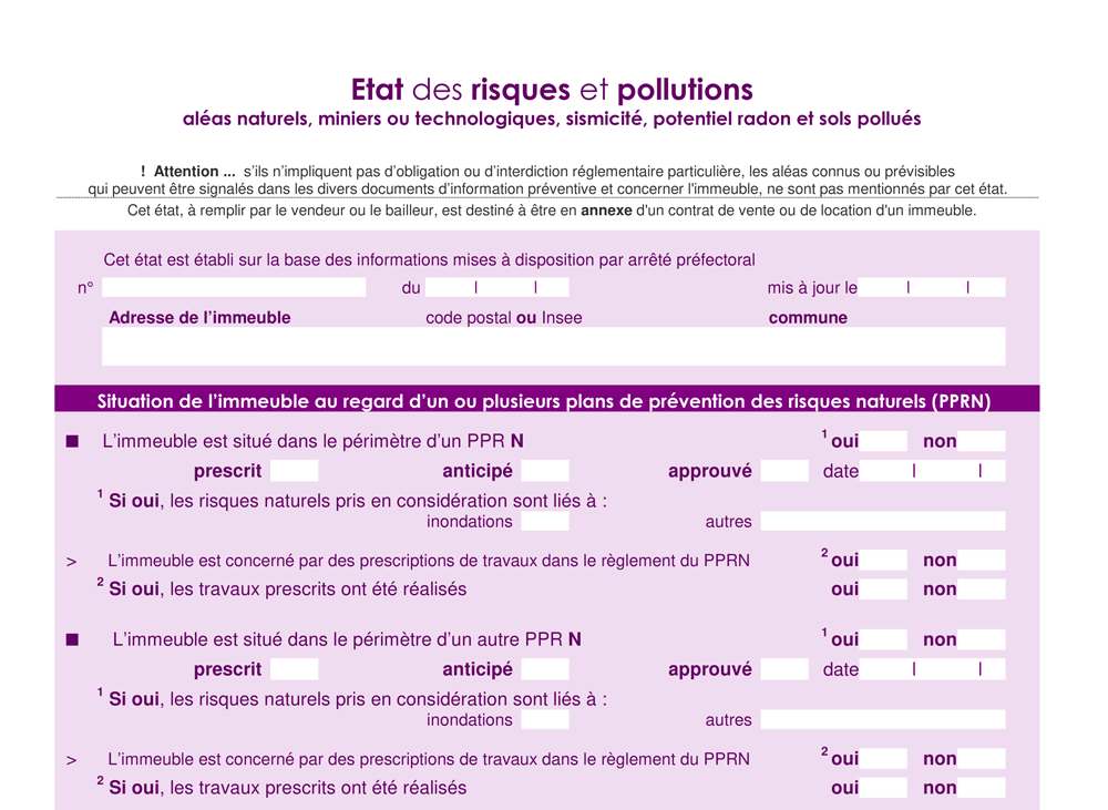 L’ERP est un diagnostic récent et peu connu. L’État des Risques et Pollution (ERP) est un diagnostic immobilier obligatoire à intégrer au dossier de diagnostic technique (DDT). Son objectif est d’informer le futur locataire ou acquéreur d’un logement des risques suivants  : naturels, miniers, technologiques, sismiques, radon et de pollution des sols auxquels il pourrait être potentiellement exposé. L’ERP remplace l’ERNT, l’ERNMT, l’ESRIS. L’ERP doit être réalisé lors de toute transaction immobilière, ou bail (location régulière, vide ou meublée, location saisonnière, vente…).